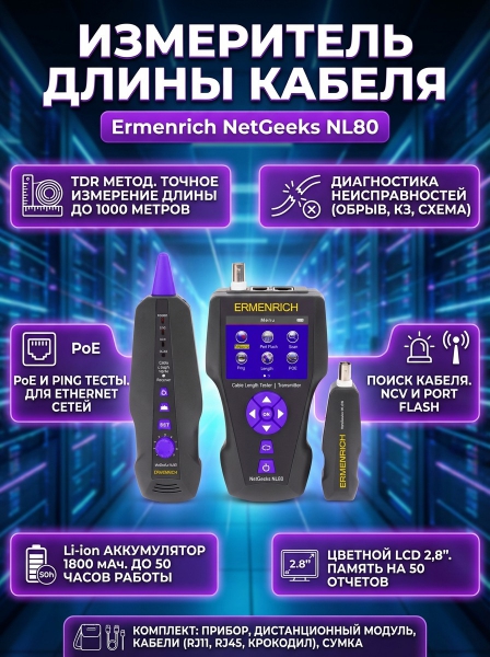Измеритель длины кабеля Ermenrich NetGeeks NL80, фиолетовый - Преимущества