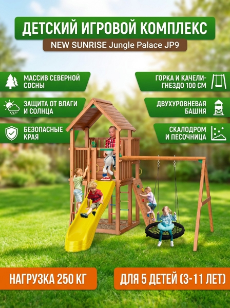Детский игровой комплекс New Sunrise Jungle Palace JP9 - ОписаниеСомневаетесь? - Посмотрите рейтинг ТОП-10 по категории «Детские игровые площадки»Детский городок Jungle Palace + Swing X'tra c гнездом изготовлен из северной древесины хвойных пород, обработанной безопасной декоративно-защитной пропиткой. Игровая башня с балконом, на который ведет небольшой скалодром, оснащена безопасной пластиковой горкой с высокими бортами. В основании предусмотрено место для размещения компактной песочницы. Активно провести время можно лазая по лесенкам, раскачиваясь на качелях (в комплекте Гнездо, диаметром 1 метр). Установка конструкции производится на ровную площадку, без дополнительных креплений и бетонирования.