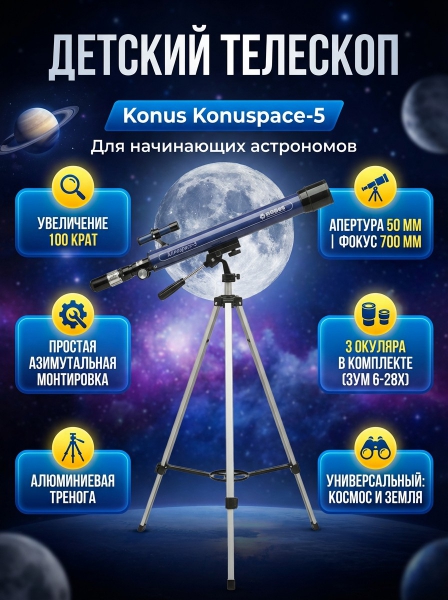 Телескоп на штативе Konus Konuspace-5 50/700 AZ - ОписаниеХотя телескоп Konus Konuspace-5 50/700 AZ и создан для детей и начинающих пользователей, он является полноценным оптическим прибором, в который можно наблюдать за Луной и наземными объектами. Он станет отличным подарком любителю науки и астрономии в частности.