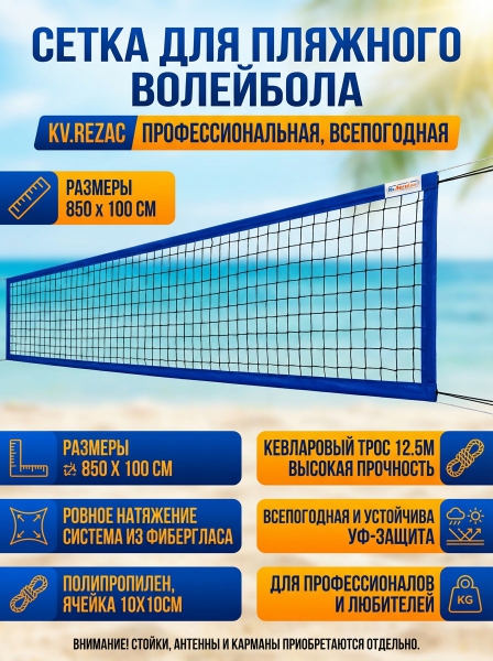 Профессиональная сетка для пляжного волейбола Kv.Rezac 15095029004 - ОписаниеПрофессиональная сетка для пляжного волейбола. Длина и ширина соответствует стандартным размерам сетки для пляжного волейбола. Но так как многие открытые площадки, в том числе и для классического волейбола, строятся не в соответствии со стандартами, то данную сетку можно рекомендовать также и для любых открытых площадок, главное, точно знать ширину площадки.
