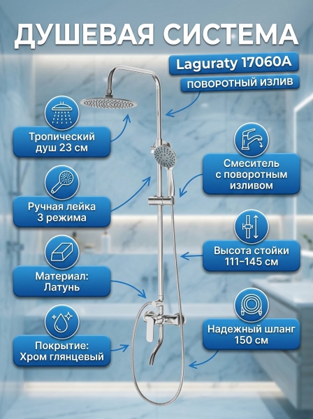 Душевая система Laguraty 17060А - ОписаниеДушевая стойка Laguraty 17060А из латуни с хромированным глянцевым покрытием.