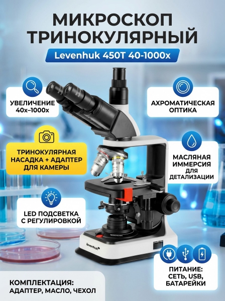 Микроскоп тринокулярный Levenhuk 450T - ОписаниеТринокулярный биологический микроскоп Levenhuk 450T – это отличный выбор для любителей и профессионалов, занимающихся изучением микромира: бактерий, органических клеток, микроорганизмов, дрожжей и т. д. Прибор подходит для использования в сферах медицины, экологии, защиты окружающей среды, ветеринарии, может применяться в лабораторных условиях, для обучения в вузах и других образовательных учреждениях.