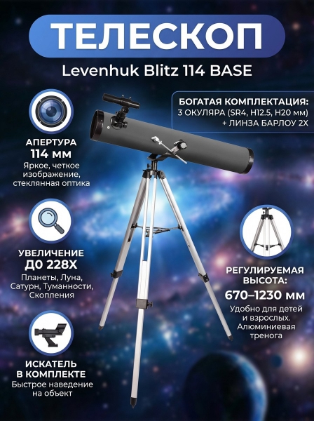 Телескоп рефлекторный Levenhuk Blitz 114 BASE - ОписаниеLevenhuk Blitz 114 BASE – рефлектор Ньютона со 114-миллиметровым сферическим зеркалом и богатой комплектацией. Это хороший вариант первого телескопа для начинающего астронома, который хочет наблюдать не только ближний, но и дальний космос. В телескоп можно ясно увидеть Луну, планеты Солнечной системы вплоть до Сатурна, шаровые скопления, диффузные и планетарные туманности, ярчайшие объекты из каталога NGC.