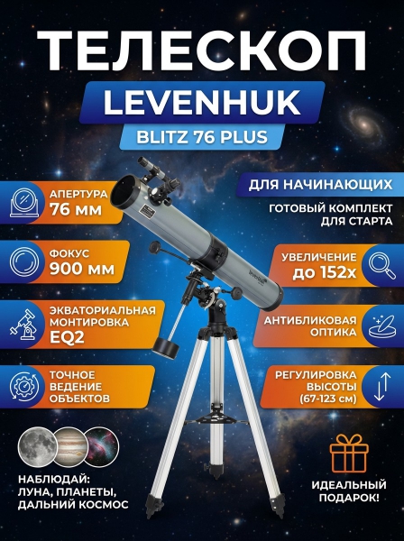 Телескоп рефлекторный Levenhuk Blitz 76 PLUS - ДоставкаДоставка по Санкт-Петербургу: бесплатно, 2-3 дня Доставка по России: стоимость уточняйте у оператора. Телескоп рефлекторный Levenhuk Blitz 76 PLUS - Отзывы0.0