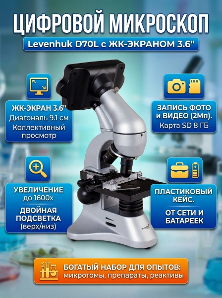 Микроскоп цифровой монокулярный Levenhuk D70L - ДоставкаДоставка по Санкт-Петербургу: бесплатно, 2-3 дня Доставка по России: стоимость уточняйте у оператора. Микроскоп цифровой монокулярный Levenhuk D70L - Отзывы0.0