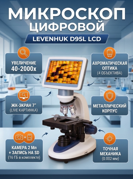 Микроскоп цифровой Levenhuk D95L LCD монокулярный - ОписаниеЦифровой микроскоп Levenhuk D95L LCD создан для учебных и лабораторных наблюдений в проходящем свете сухим и иммерсионным методом. Он идеально подходит для длительной работы, так как снабжен 7-дюймовым ЖК-экраном. Встроенная цифровая камера не только передает изображение в высоком качестве, но также позволяет фотографировать изучаемые микропрепараты и записывать видео исследований на карту памяти.