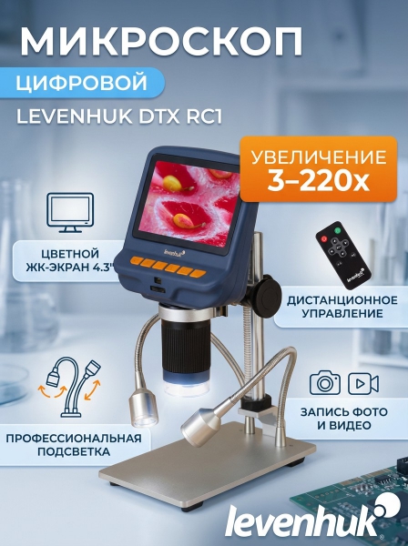 Микроскоп с дистанционным управлением Levenhuk DTX RC1 - ОписаниеМикроскоп с дистанционным управлением Levenhuk DTX RC1 – это не только отличные оптические возможности, но и новый уровень удобства управления. Для работы с прибором можно использовать кнопки на корпусе или беспроводной пульт. Микроскоп станет отличным помощником в ремонте электроники, оценке ювелирных изделии и диагностике поломок часовых механизмов. Он также пригодится для проведения презентаций и лекций.