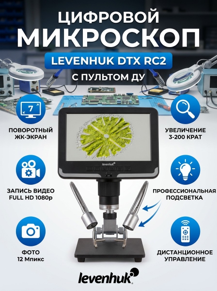 Микроскоп с дистанционным управлением Levenhuk DTX RC2 - ОписаниеМикроскоп с дистанционным управлением Levenhuk DTX RC2 – незаменимый увеличительный прибор для работы в ремонтной мастерской или сервисном центре. Он будет удобен при диагностировании поломок в механизмах и электроплатах, оценке ювелирных изделий, изучении сварных швов и припоя. Микроскоп также позволяет делать фотографии и записывать видео, а управлять прибором можно при помощи беспроводного пульта.