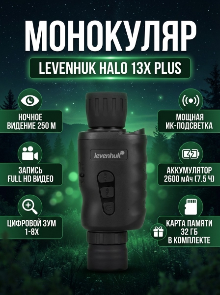 Монокуляр цифровой ночного видения Levenhuk Halo 13X PLUS - ОписаниеLevenhuk Halo 13X PLUS – монокуляр ночного видения c цифровым преобразователем, предназначенный для наблюдений в любое время суток. Возможности прибора раскроются во всей полноте на ночной охоте, в многодневном походе, при патрулировании и охране территорий. Оптика прибора выстраивает качественное изображение. Его можно приблизить и изучить в деталях: доступен цифровой зум 1–8 крат.