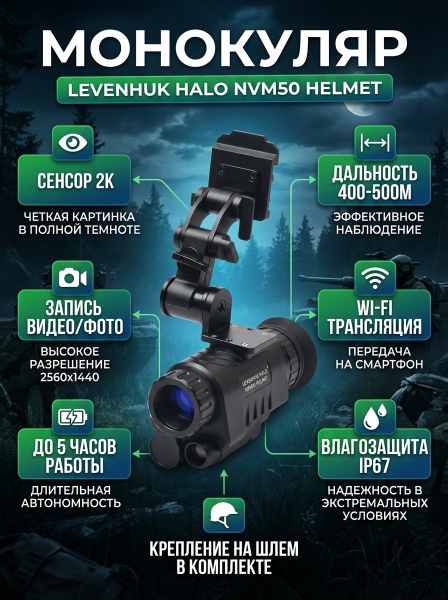 Монокуляр цифровой ночного видения Levenhuk Halo NVM50 Helmet, с креплением на шлем - ДоставкаДоставка по Санкт-Петербургу: бесплатно, 2-3 дня Доставка по России: стоимость уточняйте у оператора. Монокуляр цифровой ночного видения Levenhuk Halo NVM50 Helmet, с креплением на шлем - Отзывы0.0