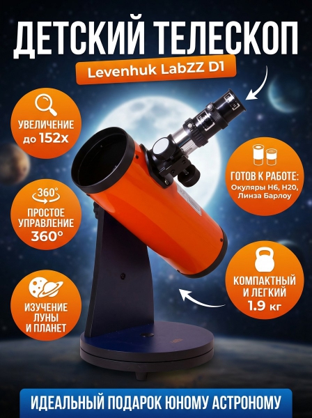 Телескоп на штативе Levenhuk LabZZ D1 - ОписаниеТелескоп Levenhuk LabZZ D1 создан для юных исследователей космоса, которые не хотят прерывать астрономические наблюдения ни на минуту. Он компактный и легкий, поэтому ребенок сможет взять его на дачу, в школу или во двор. А наблюдать можно будет всю Солнечную систему! В базовой комплектации телескоп позволяет приближать до 100 крат.