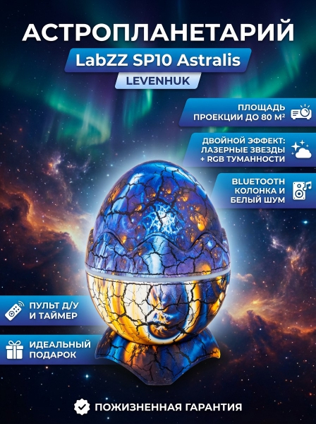 Астропланетарий Levenhuk LabZZ SP10 Astralis - ОписаниеАстропланетарий LabZZ SP10 Astralis – это космический проектор в виде фантастического яйца динозавра, который понравится детям и подросткам своим необычным дизайном и удивительными возможностями. Прибор умеет показывать красочные проекции туманностей и звезд, а также воспроизводить музыку со смартфона. Планетарий украсит собой интерьер и поможет создать фон для вечеринки или съемки креативных видео, а перед сном его можно использовать в качестве ночника. Помимо музыки, можно запускать белый шум, который помогает сделать сон более глубоким и восстанавливающим.