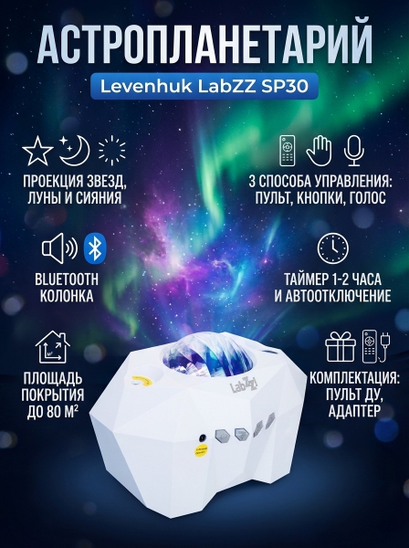 Астропланетарий Levenhuk LabZZ SP30 White - ОписаниеАстропланетарий Levenhuk LabZZ SP30 White – стильный многофункциональный прибор, который понравится как детям и подросткам, так и взрослым. Включив проектор, вы сможете любоваться красотами космоса и северным сиянием на потолке или стене комнаты. Более того: астропланетарий позволяет прослушивать музыку и поддерживает голосовое управление, то есть выполняет функции умной колонки.