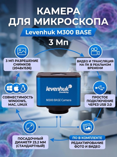 Цифровую камеру Levenhuk M300 BASE можно установить на биологический, стереоскопический или инструментальный микроскоп. В базовой комплектации камера подходит для окулярных трубок диаметром 23,2 мм. Для установки в окулярные трубки других стандартов надо приобрести адаптер.