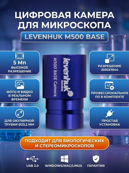Цифровая камера Levenhuk M500 BASE устанавливается в окулярную трубку микроскопа на место штатного окуляра. Посадочный диаметр – 23,2 мм. Для использования с микроскопами других стандартов необходимо приобрести адаптер (не входит в комплект поставки).