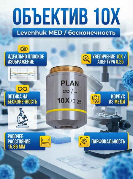 Объектив планахроматический Levenhuk MED 10x/беск - ОписаниеПланахроматический объектив Levenhuk MED 10x/беск – аксессуар для микроскопов, длина тубуса которых скорректирована на бесконечность. Подобные микроскопы широко применяются в лабораториях, так как позволяют свободно использовать дополнительные исследовательские инструменты – поляризаторы, фазово-контрастные устройства и другие.