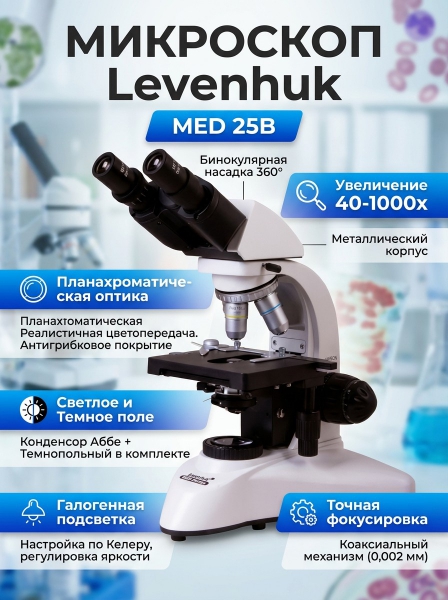 Микроскоп бинокулярный Levenhuk MED 25B - ОписаниеМикроскоп Levenhuk MED 25B – бинокулярный оптический прибор для наблюдений в светлом и темном поле. Он позволяет настраивать освещение по Келеру, использовать масляную иммерсию и детально изучать микропрепараты на увеличении от 40 до 1000 крат.