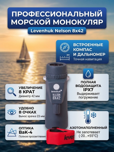 Монокуляр Levenhuk Nelson 8x42 - ОписаниеМорской монокуляр Nelson 8x42 – классический оптический прибор для морских путешествий или рыбалки. Встроенные дальномер и компас позволяют измерять расстояния и точно определять направление. Оптика изготовлена из высококачественного стекла BaK-4. На линзы нанесено полное многослойное просветляющее покрытие, благодаря которому монокуляр передает яркую картинку с высокой детализацией. Увеличение оптического прибора составляет 8 крат, апертура – 42 мм. Монокуляр обеспечивает широкое поле зрения – 120 м на расстоянии 1000 м. С его помощью удобно следить за морским горизонтом. Встроенные компас и дальномер позволяют проводить измерения во время наблюдений. Шкалы видны в окуляре, вычисления проводятся по специальной формуле. С помощью показаний дальномера можно вычислить расстояние до объекта известного размера. И наоборот – если известно расстояние до объекта, можно рассчитать его размер (высоту). Встроенный компас показывает направление на объект, выраженное в градусах. Север находится на отметке 360°, юг – 180°, восток – 90° и запад – 270°. Цена деления – 1 градус. Подсветки у компаса нет, поэтому мы рекомендуем пользоваться им при дневном свете. На воде и вблизи водоемов рекомендуем всегда использовать монокуляр с плавающим ремнем FS10 – яркий ремень не даст прибору погрузиться под воду и потеряться.
