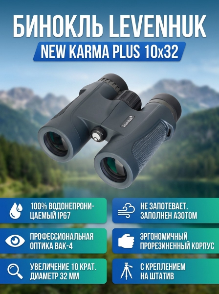 Бинокль Levenhuk New Karma PLUS 10x32 - ОписаниеБинокль Levenhuk New Karma PLUS 10x32 подходит для использования в походных и полевых условиях и применяется для ведения наблюдений за дикой природой и изучения местности на средних и дальних дистанциях. Этот прибор станет отличным помощником в ситуациях, когда необходимо продолжать работу, невзирая на сложные окружающие условия: сумерки, пасмурную погоду и недостаток дневного света, идущие дождь или снег. Бинокль герметизирован по стандарту IP67, защищен от пыли и влаги, а также может свободно использоваться рядом с водоемами – ему не повредит случайное падение в воду на глубину до 1 метра.
