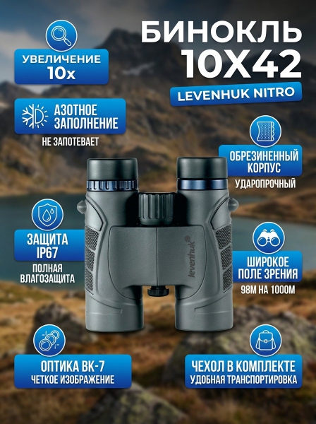 Бинокль полевой Levenhuk Nitro 10x42 - ДоставкаДоставка по Санкт-Петербургу: бесплатно, 2-3 дня Доставка по России: стоимость уточняйте у оператора. Бинокль полевой Levenhuk Nitro 10x42 - Отзывы0.0