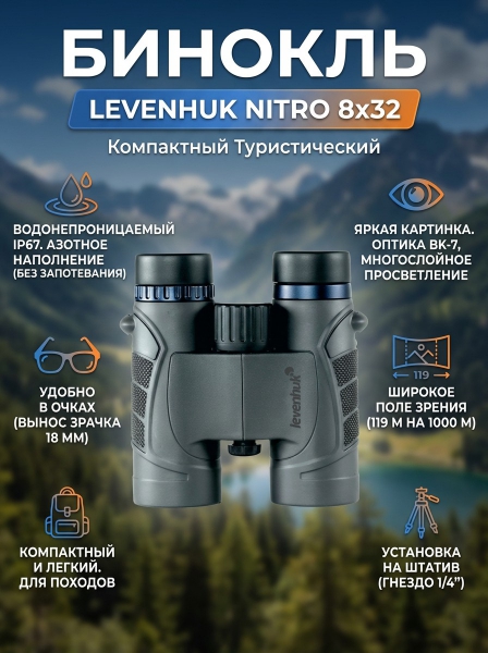 Бинокль туристический Levenhuk Nitro 8x32 - ДоставкаДоставка по Санкт-Петербургу: бесплатно, 2-3 дня Доставка по России: стоимость уточняйте у оператора. Бинокль туристический Levenhuk Nitro 8x32 - Отзывы0.0