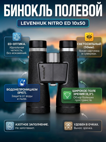 Бинокль полевой Levenhuk Nitro ED 10x50 - ОписаниеБинокль Levenhuk Nitro ED 10x50 собрал в себе все необходимое для охоты и отдыха на природе. Водонепроницаемый корпус защитит от дождя, азотное заполнение предотвратит запотевание линз, просветленная оптика подарит яркую картинку в облачный день. Увеличения 10,5 крата будет достаточно для детального рассматривания удаленных объектов, широкое поле зрения позволит охватить большую область ландшафта одним взглядом.