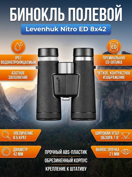 Бинокль полевой Levenhuk Nitro ED 8x42 - БрендСтрана бренда: США Премиальность бренда:Бинокль полевой Levenhuk Nitro ED 8x42 - Характеристики