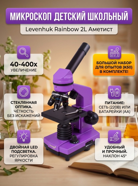 Микроскоп монокулярный Levenhuk Rainbow 2L Amethyst/Аметист - ОписаниеЯркий фиолетовый корпус микроскопа Levenhuk Rainbow 2L не оставит вашего ребенка равнодушным. Этот микроскоп создан специально для первого знакомства с микромиром – с его помощью юный исследователь узнает, как устроены крылышки насекомых, из чего состоит бумага, кто живет в капле воды и многое другое. В комплекте есть все, что нужно для первых опытов с микроскопом.
