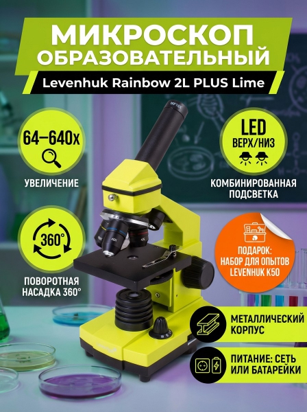 Микроскоп монокулярный Levenhuk Rainbow 2L PLUS Lime/Лайм - ОписаниеС помощью микроскопа Levenhuk Rainbow 2L PLUS Lime/Лайм можно изучать привычные предметы окружающего мира, ставить интересные опыты и даже проводить серьезные исследования. Благодаря качественной оптике и надежной конструкции прибор подойдет и любознательному подростку, и студенту-биологу. Микроскоп отличается стильным дизайном – его яркий корпус цвета сочного лайма будет прекрасно смотреться на рабочем столе или в лаборатории.