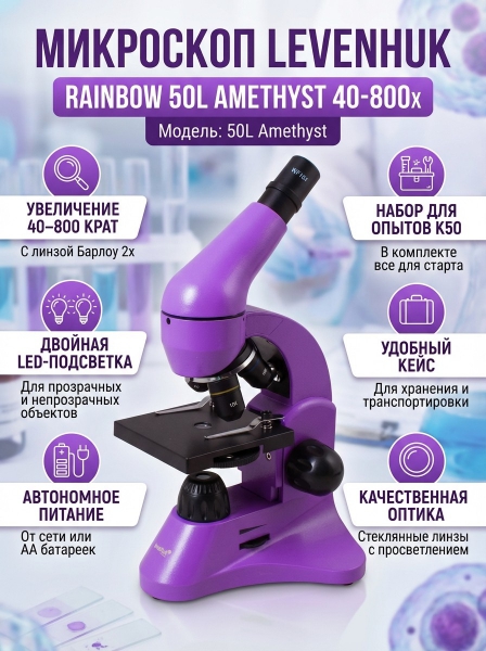 Микроскоп монокулярный Levenhuk Rainbow 50L Amethyst - ДоставкаДоставка по Санкт-Петербургу: бесплатно, 2-3 дня Доставка по России: стоимость уточняйте у оператора. Микроскоп монокулярный Levenhuk Rainbow 50L Amethyst - Отзывы0.0