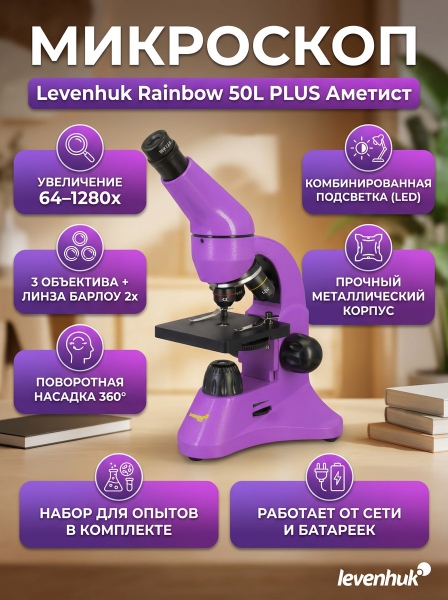 Микроскоп монокулярный Levenhuk Rainbow 50L PLUS Amethyst/Аметист - ДоставкаДоставка по Санкт-Петербургу: бесплатно, 2-3 дня Доставка по России: стоимость уточняйте у оператора. Микроскоп монокулярный Levenhuk Rainbow 50L PLUS Amethyst/Аметист - Отзывы0.0