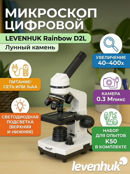 Микроскоп Levenhuk Rainbow D2L 0.3 Мпикс Moonstone/Лунный камень - ДоставкаДоставка по Санкт-Петербургу: бесплатно, 2-3 дня Доставка по России: стоимость уточняйте у оператора. Микроскоп Levenhuk Rainbow D2L 0.3 Мпикс Moonstone/Лунный камень - Отзывы0.0