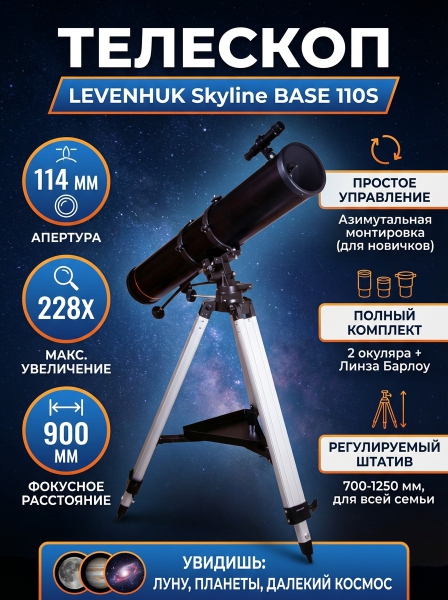 Телескоп на штативе Levenhuk Skyline BASE 110S - ДоставкаДоставка по Санкт-Петербургу: бесплатно, 2-3 дня Доставка по России: стоимость уточняйте у оператора. Телескоп на штативе Levenhuk Skyline BASE 110S - Отзывы0.0