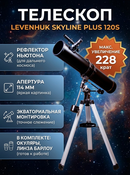 Телескоп на штативе Levenhuk Skyline PLUS 120S - ДоставкаДоставка по Санкт-Петербургу: бесплатно, 2-3 дня Доставка по России: стоимость уточняйте у оператора. Телескоп на штативе Levenhuk Skyline PLUS 120S - Отзывы0.0