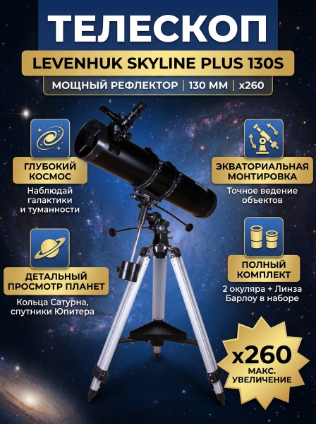 Телескоп на штативе Levenhuk Skyline PLUS 130S - ДоставкаДоставка по Санкт-Петербургу: бесплатно, 2-3 дня Доставка по России: стоимость уточняйте у оператора. Телескоп на штативе Levenhuk Skyline PLUS 130S - Отзывы0.0