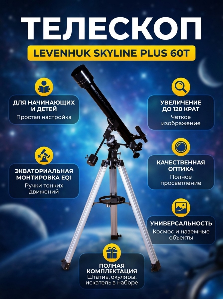 Телескоп на штативе Levenhuk Skyline PLUS 60T - БрендСтрана бренда: США Премиальность бренда:Телескоп на штативе Levenhuk Skyline PLUS 60T - Характеристики