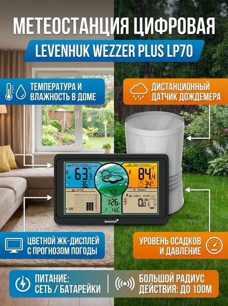 Метеостанция Levenhuk Wezzer PLUS LP70 - ОписаниеWezzer PLUS LP70 – многофункциональная метеостанция, которая предоставляет исчерпывающую информацию о погоде и микроклимате в помещении. Основной блок станции проводит внутренние измерения, регистрируя температуру и влажность дома. Внешний датчик определяет уличные показатели: температуру, влажность и количество осадков. Сведения передаются на станцию по радиосвязи. Станция измеряет давление, прогнозирует погоду на ближайшее время, отображает тенденции к изменениям параметров и уровень общего комфорта.