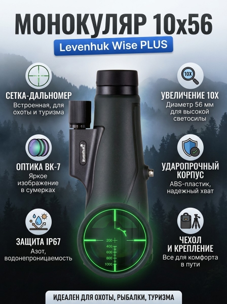 Монокуляр Levenhuk Wise PLUS 10x56 с сеткой - БрендСтрана бренда: США Премиальность бренда:Посмотреть все оптические монокуляры для охоты и рыбалки Levenhuk (5) Монокуляр Levenhuk Wise PLUS 10x56 с сеткой - Характеристики