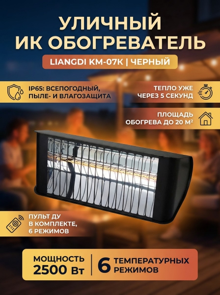 Уличный ИК обогреватель с пультом ДУ Kvimol КМ-07К(ч) черный - ОписаниеИнфракрасный обогреватель уличных пространств Kvimol КМ-07К(ч) — это более экономичная альтернатива лидерам европейского рынка. Обогреватель собирается из идентичных комплектующих, в первую очередь ламп. Основное назначение - обогрев на открытом воздухе. За счет использования коротковолновой инфракрасной технологии, большая часть энергии расходуется именно на прогрев поверхности, а не воздуха.