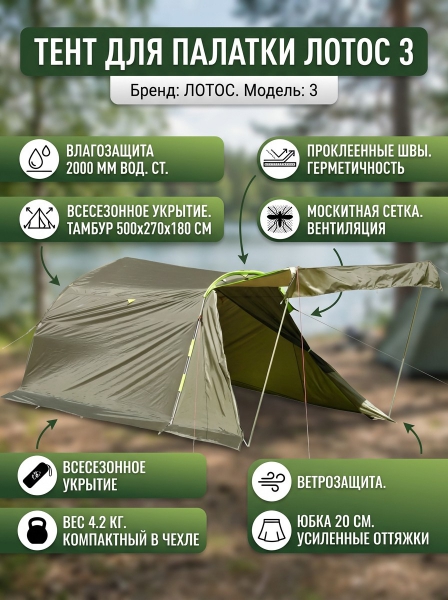 Влагозащитный тент-тамбур Лотос 3 (7073 ) - ОписаниеВлагозащитный тент-тамбур "Лотос 3" устанавливается поверх купола палатки и формирует тамбур – дополнительное помещение перед ее входом. Тент защищает укрытие от осадков, ветра, солнца и москитов, а также повышает теплоизоляцию внутреннего пространства самой палатки за счет дополнительного слоя ткани.