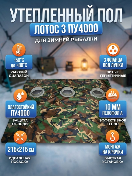 Пол утепленный Лотос 3 ПУ4000 с отверстиями под лунки с фланцами - ДоставкаДоставка по Санкт-Петербургу: бесплатно, 2-3 дня Доставка по России: стоимость уточняйте у оператора. Пол утепленный Лотос 3 ПУ4000 с отверстиями под лунки с фланцами - Отзывы0.0