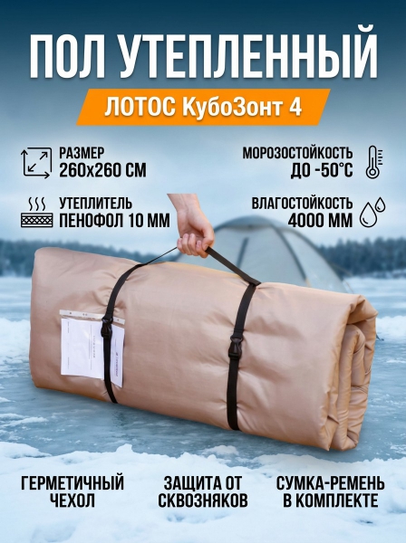 Пол утепленный Лотос КубоЗонт 4 ПУ4000 - ОписаниеПол утепленный Лотос КубоЗонт 4 имеет квадратную форму и предназначен для утепления и защиты от влаги жилого пространства палаток с размером дна не более 260 х 260 см. Утепленный пол крепится изнутри на крючках, накрывая внутреннюю юбку палатки и предотвращая задувание ветра снизу.