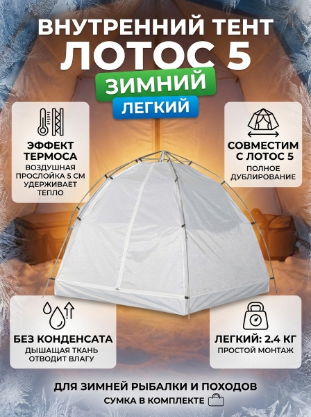 Внутренний тент легкий зимний Лотос 5 - ДоставкаДоставка по Санкт-Петербургу: 395 ₽, 2-3 дня Доставка по России: стоимость уточняйте у оператора. Внутренний тент легкий зимний Лотос 5 - Отзывы0.0