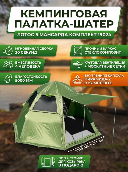 Кемпинговая палатка Лотос 5 Мансарда Комплект 19024 - ДоставкаДоставка по Санкт-Петербургу: бесплатно, 2-3 дня Доставка по России: стоимость уточняйте у оператора. Кемпинговая палатка Лотос 5 Мансарда Комплект 19024 - Отзывы0.0