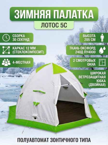 Лотос 5С - шестигранная полуавтоматическая палатка зонтичного типа раскрытия. Тент и каркас образуют единую цельную конструкцию, благодаря чему при раскрытии палатка сразу же принимает окончательную жесткую и устойчивую форму. Палатка оснащена максимально-возможным количеством усиленных креплений для фиксации на льду, что обеспечивает ей способность выдерживать высокие ветровые нагрузки.