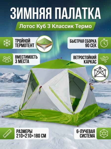 Утепленная зимняя палатка Лотос Куб 3 Классик Термо - ОписаниеЛотос куб 3 Классик Термо – полуавтоматическая палатка куб для зимней рыбалки с системой теплоизоляции тента. Тент состоит из трех слоев материала сшитых между собой по периметру деталей тента: верхний слой – ветровлагозащитная ткань повышенной плотности Polyester Oxford 300D WR, промежуточный слой – нетканое полотно из высокотехнологичного теплоизоляционного ворсистого материала, нижний слой - влагозащитная ткань Polyester Oxford 210D.