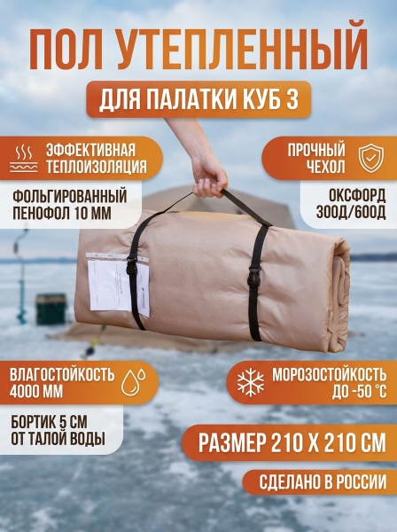 Пол утепленный Лотос Куб 3 ПУ4000 - ОписаниеПол утепленный Лотос Куб 3 ПУ4000 имеет квадратную форму и предназначен для использования в палатках конструкции «куб» с размером дна не более 210 х 210 см. Пол изготовлен из теплоизоляционного материала с металлизированным покрытием, вложенного в герметичный чехол, который характеризуется высоким показателем влагостойкости и прочности.