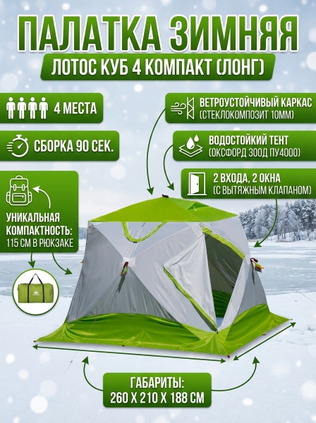 Зимняя палатка Лотос Куб 4 Компакт - ОписаниеЛотос Куб 4 Компакт (лонг) – полуавтоматическая зимняя палатка куб удлиненной формы. Однослойная зимняя палатка с прочным герметичным тентом, надежной системой гидроизоляции дна, системой защиты от дождя и профессиональным оснащением для зимней рыбалки обеспечит пользователям домашний комфорт в процессе эксплуатации.