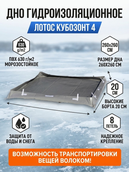 Дно гидроизоляционное Лотос КубоЗонт 4 - ОписаниеДно гидроизоляционное Лотос КубоЗонт 4 имеет четырехгранную форму размером 260 х 260 см, предназначено для палатки "Лотос КубоЗонт 4 Термо", (крепится с внешней стороны тента палатки). Гидроизоляционное дно изготовлено из цельнокроеного прочного морозостойкого материала ПВХ плотностью 630 г/м2 и выполнено по форме корыта с защитными бортами высотой 20 см. Небольшой вес и компактный размер в сложенном виде, позволяют укладывать гидроизоляционное дно в сумку вместе с палаткой.