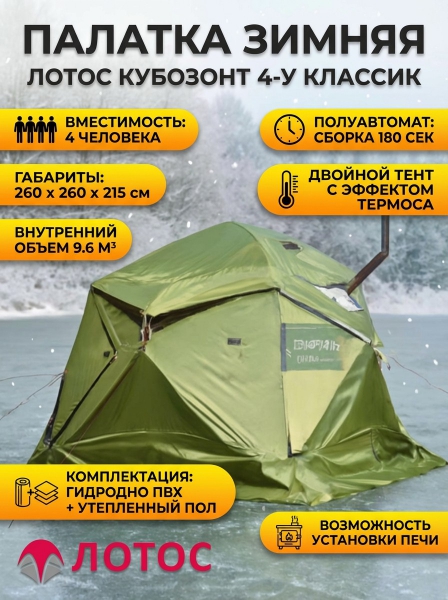 Палатка Лотос КубоЗонт 4-У Классик+Гидродно+Утепленный пол - ОписаниеЛотос КубоЗонт 4-У – полуавтоматическая универсальная палатка кубозонт. Высокое, теплое укрытие, с монолитной устойчивостью, максимальной защитой от непогоды и богатым оснащением обеспечит Вам надежность и безопасность проживания на природе!